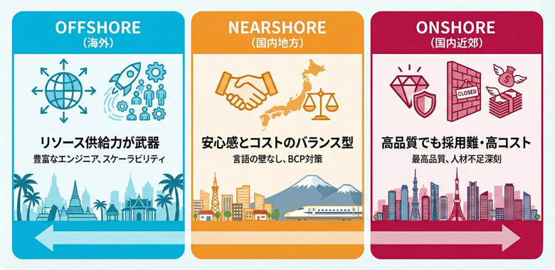 「オフショア」「ニアショア」「オンショア」は、開発拠点の「場所(距離)」を示す言葉ですが、2026年現在、その選び方の基準は大きく変化しています。
