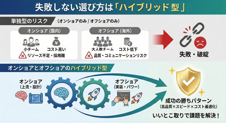 2026年現在、成功しているプロジェクトの多くは、オンショア(国内)とオフショア(海外)の良いとこ取りをする「ハイブリッド型」を採用しています。