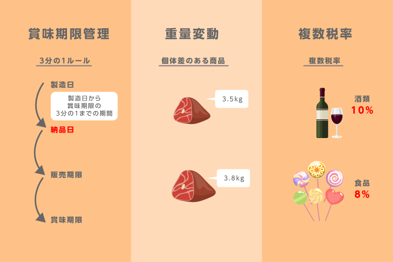 食品業界には、賞味期限の「3分の1ルール」や、食肉・鮮魚のように個体ごとに重さが異なる「不定貫(ふていかん)」商品など、他業界にはない複雑な商習慣があります。