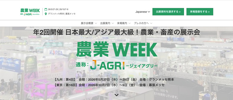 「農業WEEK(J-AGRI)」は、熊本と幕張で年2回開催される農業・畜産の総合展です。